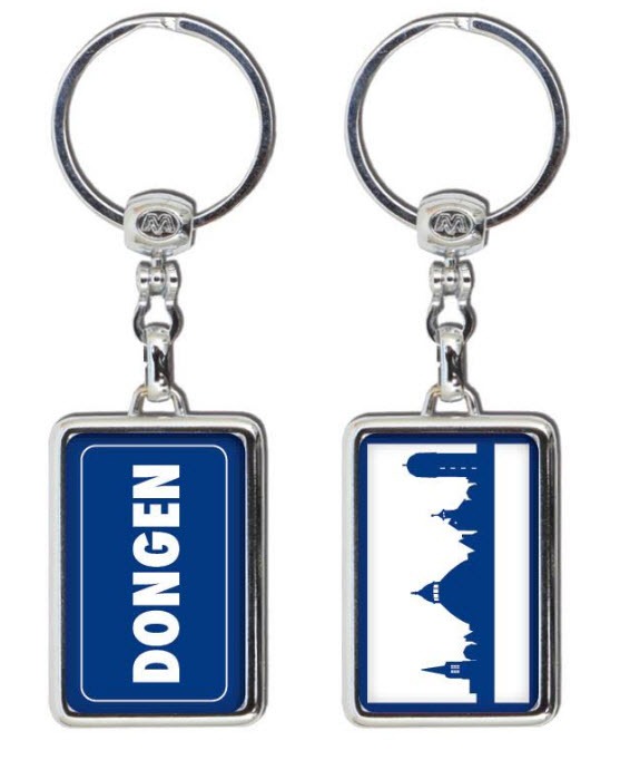 Fraaie sleutelhanger met aan de ene kant de skyline van Dongen en aan de andere kant de naam Dongen